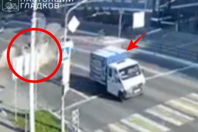 우크라이나와 국경을 맞대고 있는 접경지역인 러시아 서부 벨고로드에서 간발의 차로 우크라이나군의 드론 공격을 피한 트럭의 모습이 공개됐다.