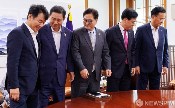 [서울=뉴스핌] 윤창빈 기자 = 우원식 국회의장과 김병기 더불어민주당 원내대표, 송언석 국민의힘 비상대책위원장 겸 원내대표가 19일 오후 서울 여의도 국회에서 열린 의장 주재 여야 원내대표 회동에서 기념촬영을 마치고 자리로 돌아서고 있다. 왼쪽부터 문진석 더불어민주당 원내운영수석부대표, 김 원내대표, 우 의장, 송 원내대표, 유상범 국민의힘 원내수석부대표. 2025.08.19 pangbin@newspim.com