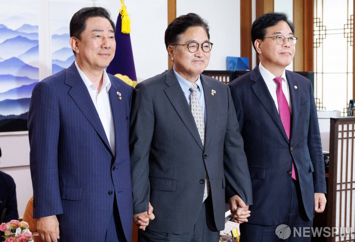 [서울=뉴스핌] 윤창빈 기자 = 우원식 국회의장과 김병기 더불어민주당 원내대표, 송언석 국민의힘 비상대책위원장 겸 원내대표가 19일 오후 서울 여의도 국회에서 열린 의장 주재 여야 원내대표 회동에서 기념촬영을 하고 있다. 왼쪽부터 김 원내대표, 우 의장, 송 원내대표. 2025.08.19 pangbin@newspim.com