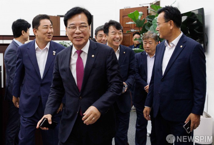 [서울=뉴스핌] 윤창빈 기자 = 김병기 더불어민주당 원내대표, 송언석 국민의힘 비상대책위원장 겸 원내대표 등 참석자들이 19일 오후 서울 여의도 국회에서 열린 우원식 국회의장 주재 여야 원내대표 회동에 참석하고 있다. 2025.08.19 pangbin@newspim.com