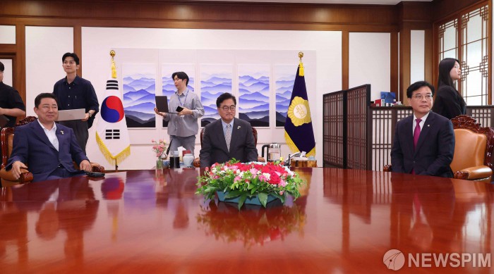 [서울=뉴스핌] 윤창빈 기자 = 우원식 국회의장이 19일 오후 서울 여의도 국회에서 여야 원내대표 회동을 주재하고 있다. 2025.08.19 pangbin@newspim.com