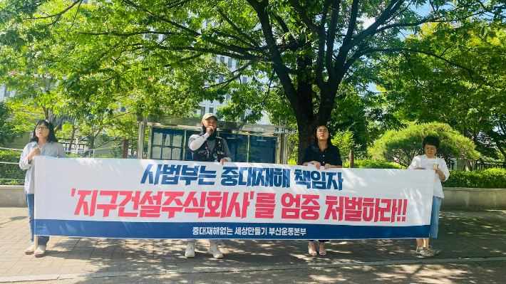 19일 '부산 중대재해처벌법 2호 사건' 항소심 선고 직후 '솜방망이 처벌 규탄 기자회견'이 열리고 있다. 중대재해없는 세상만들기 부산운동본부 제공 |