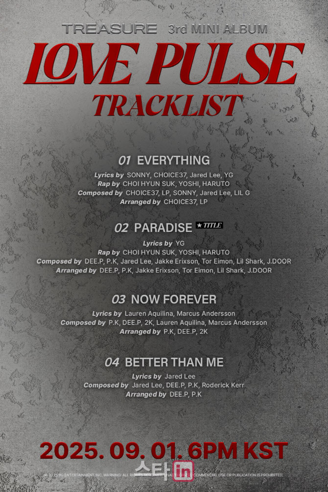 소속사 YG엔터테인먼트가 공식 블로그에 게재한 ‘러브 펄스’ 트랙리스트 포스터에 따르면 트레저는 이번 앨범에 타이틀곡 ‘파라다이스’(PARADISE)를 비롯해 ‘에브리씽’(EVERYTHING), ‘나우 포에버’(NOW FOREVER), ‘베러 댄 미’(BETTER THAN ME) 등 4곡을 수록했다.