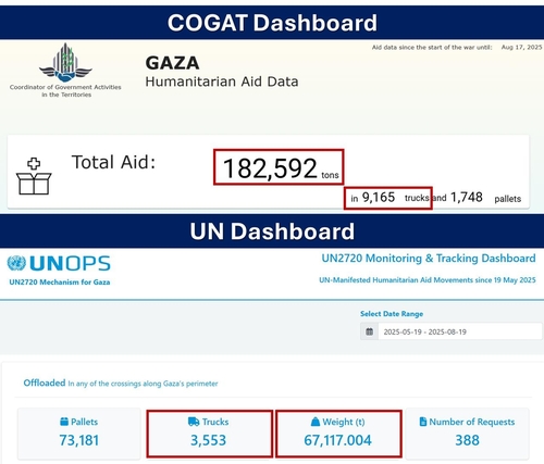 COGAT는 자체 집계를 유엔 웹사이트에 게시된 수치와 비교한 그래픽을 제시하며 "거의 트럭 6천대가 누락된 것으로, 유엔 주장보다 2.5배는 많은 구호품이 들어간 것"이라고 강조했다.