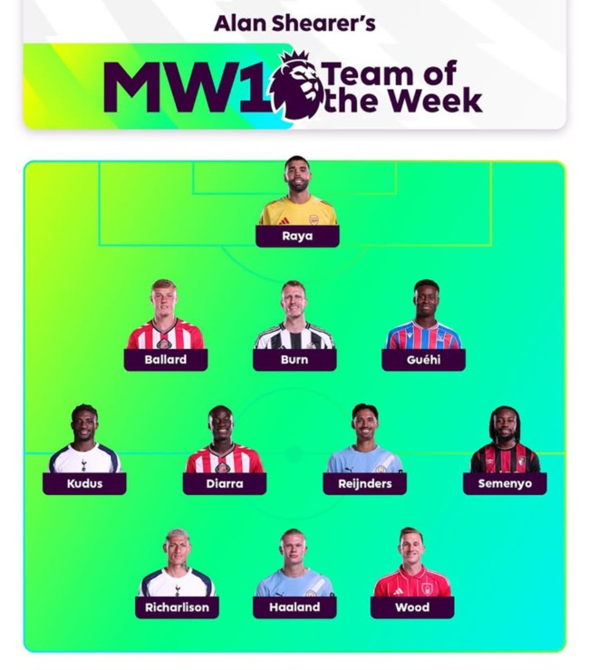 프리미어리그 사무국은 19일(한국시간) 공식 SNS를 통해 앨런 시어러가 선정한 2025-26시즌 프리미어리그 1라운드 베스트 일레븐을 발표했다.