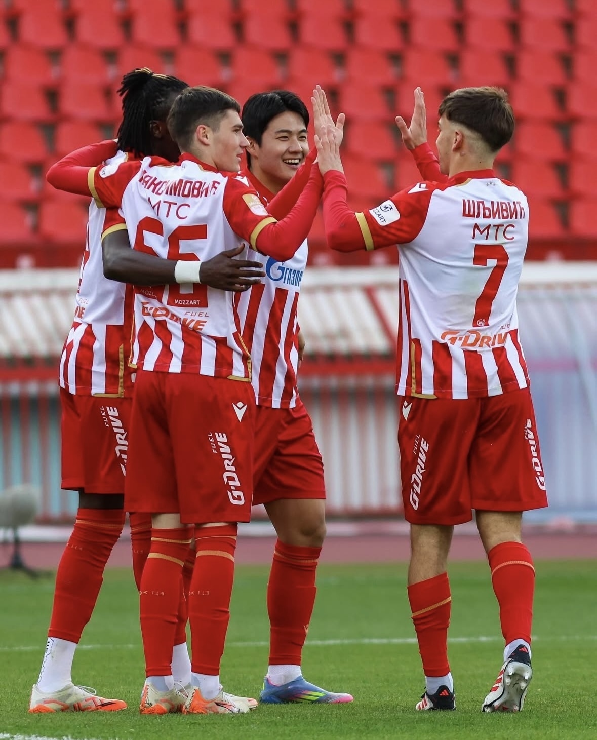 츠르베나 즈베즈다의 설영우(왼쪽에서 3번째)가 동료들과 기쁨을 나누고 있다. 사진=츠르베나 즈베즈다 SNS 캡처 |