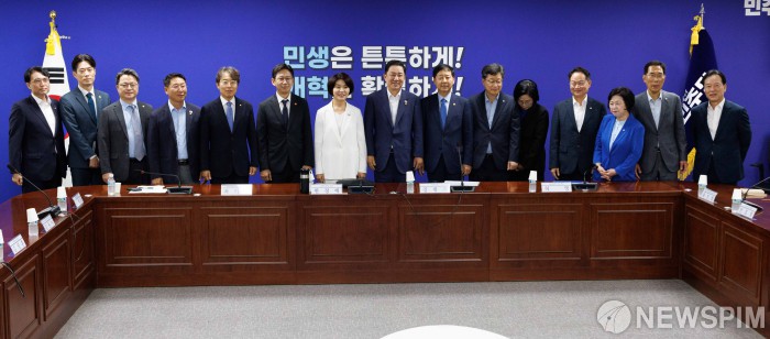 [서울=뉴스핌] 윤창빈 기자 = 배경훈 과학기술정보통신부 장관(왼쪽 여섯 번째부터), 한정애 더불어민주당 정책위의장, 김병기 더불어민주당 원내대표, 구윤철 부총리 겸 기획재정부 장관 등 참석자들이 20일 오전 서울 여의도 국회 의원회관에서 열린 새정부 경제성장전략 당정협의에서 기념촬영을 하고 있다. 2025.08.20 pangbin@newspim.com