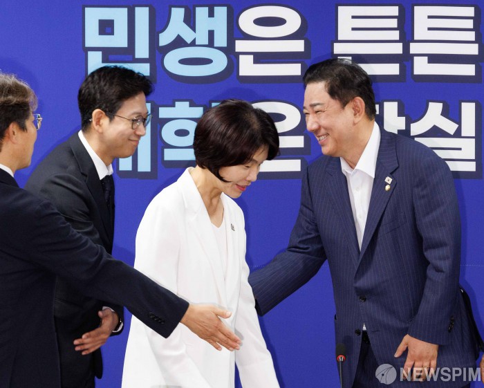 [서울=뉴스핌] 윤창빈 기자 = 김병기 더불어민주당 원내대표, 배경훈 과학기술정보통신부 장관이 20일 오전 서울 여의도 국회 의원회관에서 열린 새정부 경제성장전략 당정협의에서 악수를 하고 있다. 2025.08.20 pangbin@newspim.com