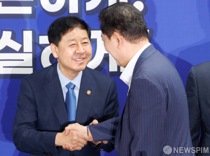 [서울=뉴스핌] 윤창빈 기자 = 김병기 더불어민주당 원내대표, 구윤철 부총리 겸 기획재정부 장관이 20일 오전 서울 여의도 국회 의원회관에서 열린 새정부 경제성장전략 당정협의에서 악수를 하고 있다. 2025.08.20 pangbin@newspim.com |