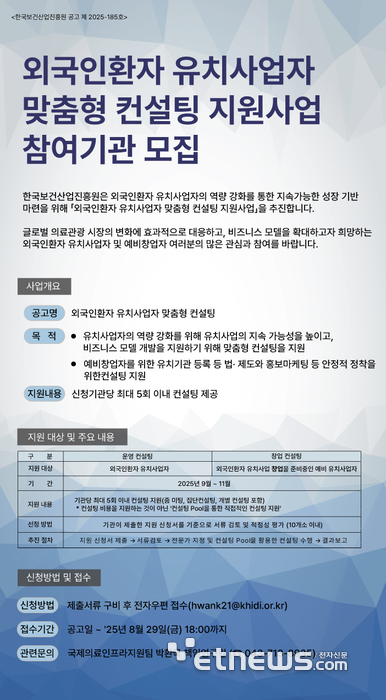 컨설팅 지원사업은 외국인환자 유치사업자뿐 아니라 유치사업을 준비하고 있는 예비창업자를 위한 유치기관 등록 등 법·제도와 홍보 마케팅에 이르기까지 안정적 정착을 위한 창업컨설팅도 함께 지원된다.