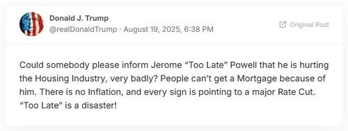 트럼프 대통령은 이날 소셜미디어 '트루스소셜' 게시물에서 "누가 제발 제롬 뒷북 파월에게 그가 주택 시장을 심하게 망치고 있다는 점을 알려달라"며 "그(파월) 탓에 사람들이 주택담보대출을 못 받고 있다. 인플레이션은 없고, 모든 신호들이 대폭 금리인하를 가리키고 있다"고 말했다.
