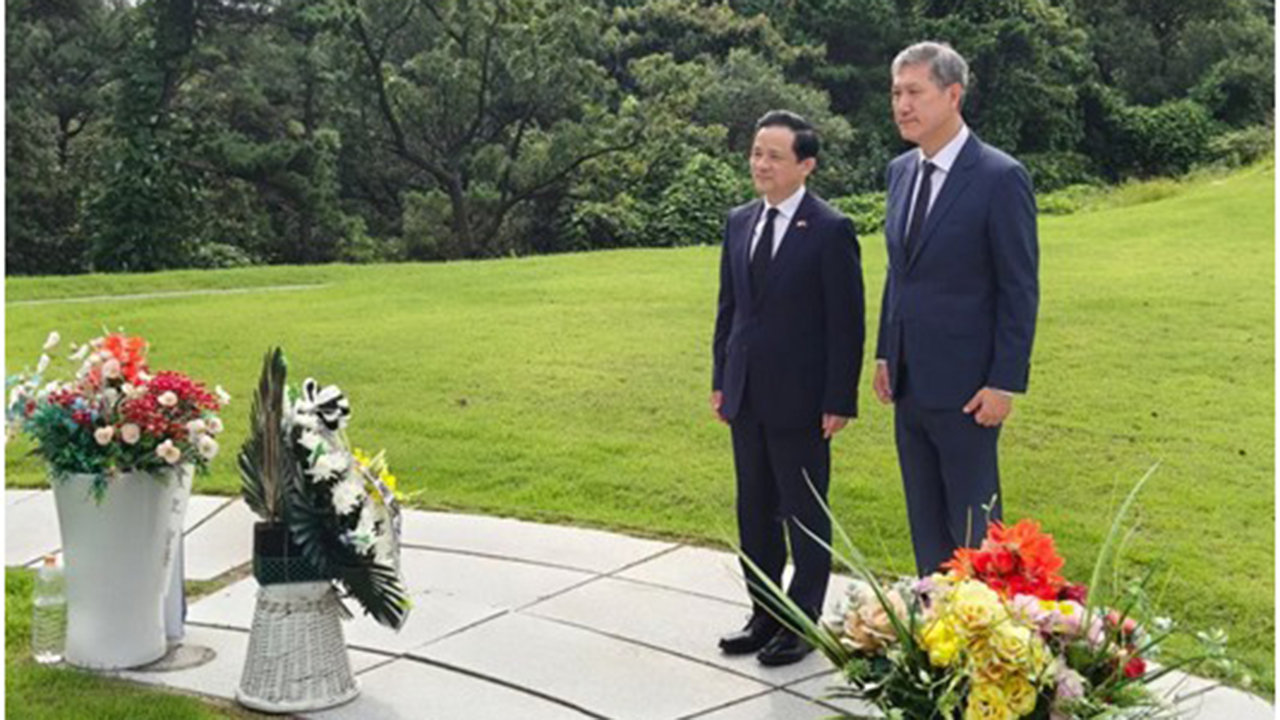 ▲ 고(故) 노태우 전 대통령 묘역을 참배하는 다이빙 주한중국대사(좌)와 노 전 대통령 아들 노재헌 동아시아문화센터 이사장