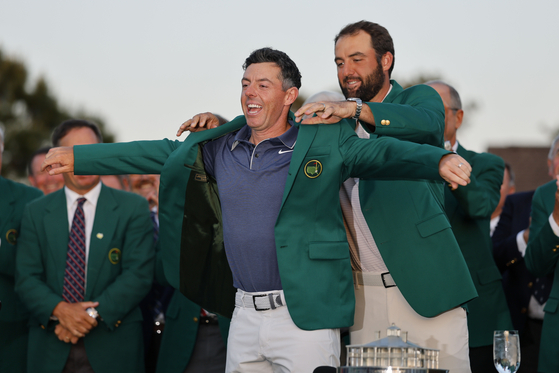 올해 마스터스를 제패한 로리 매킬로이(앞)가 지난해 우승자 스코티 셰플러로부터 그린 재킷을 건네받아 입고 있다. 둘은 22일 개막하는 투어 챔피언십에서 페덱스컵 챔피언 자리를 놓고 격돌한다. EPA=연합뉴스 |