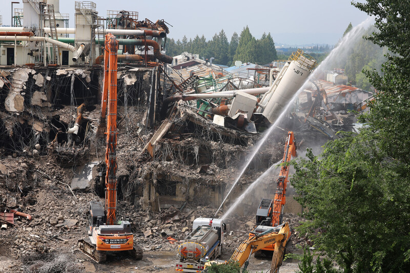 18일 광주 광산구 금호타이어 광주공장에서 지난 5월 화재가 발생한 정련공장 해체 작업이 진행되고 있다. |