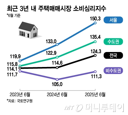 주택 매매심리의 상승세도 두드러졌다. 특히 대출규제 시행 직전인 올해 6월 기준 전국 주택매매시장 소비심리지수는 124.3, 수도권 135.4로 최근 3년 중 가장 높은 수준을 나타냈다. 서울은 150.3을 기록하며 전년 동월(133.0) 대비 가장 큰 폭으로 올랐다. 비수도권은 111.3으로 비교적 안정적인 변동을 보였다.
