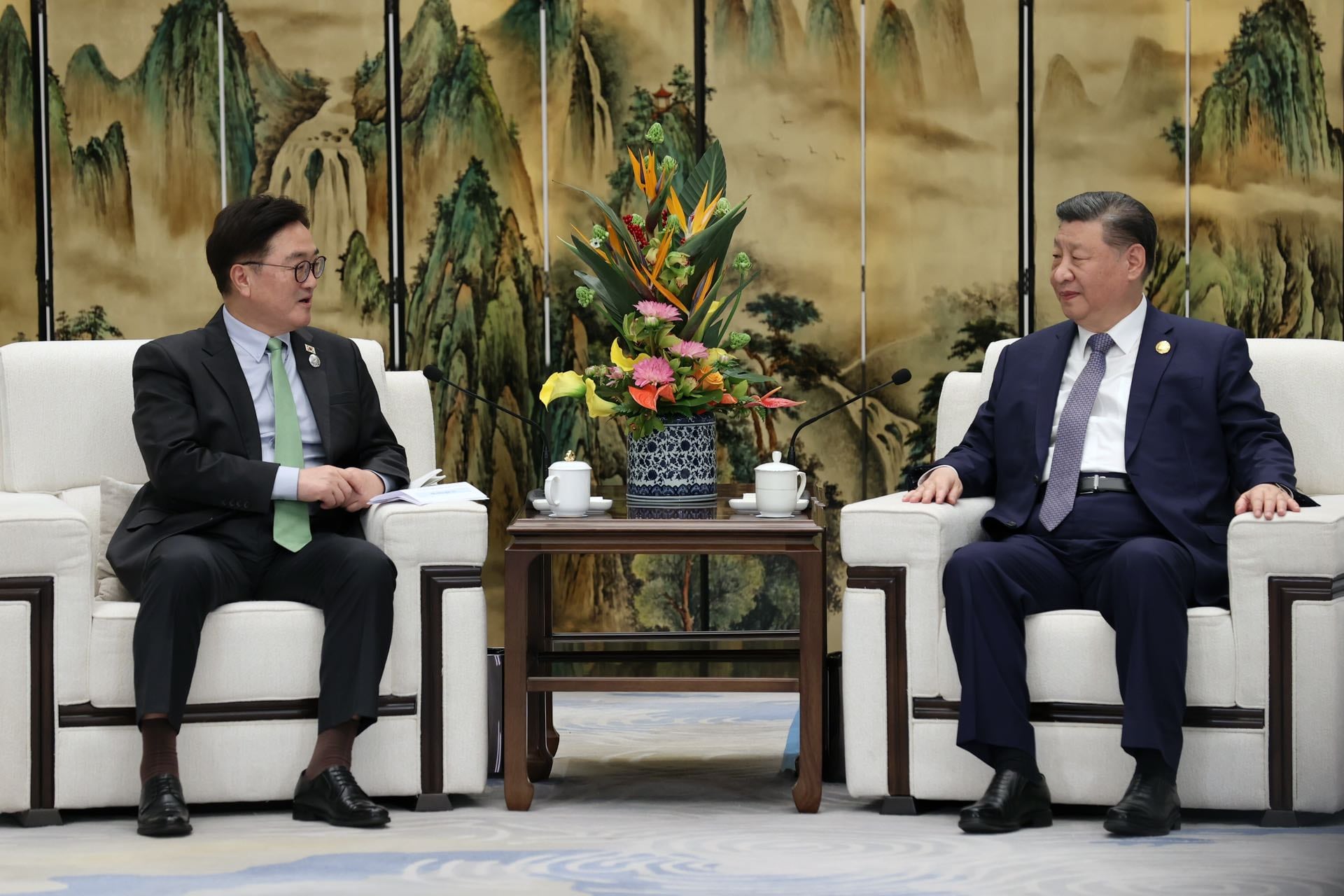 지난 2월 7일 동계 아시안게임 개막식에 참석차 중국 헤이룽장성 하얼빈시를 방문한 우원식 국회의장이 타이양다오호텔에서 시진핑 중국 국가주석을 접견하고 있다./국회의장실 |