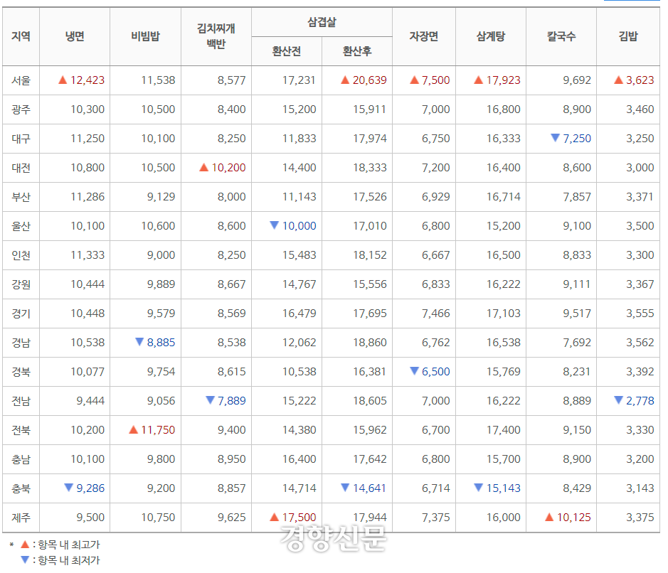 칼국수 ‘제주’ 비빔밥 ‘전북’ 최고가