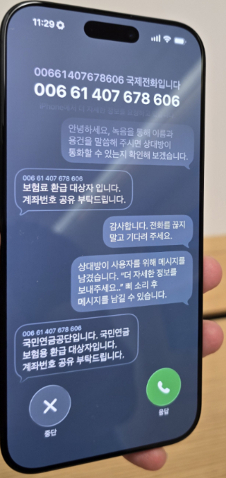 모르는 번호로 전화가 걸려오고 곧 문자가 뜬다. "국민연금공단입니다. 보험료 환급 대상자입니다. 계좌번호 공유 부탁드립니다." 딱 봐도 스팸이라는 걸 알 수 있는 내용이다. 사용자가 '중단' 아이콘을 누르면 전화 연결 없이 바로 통화가 끊어진다.