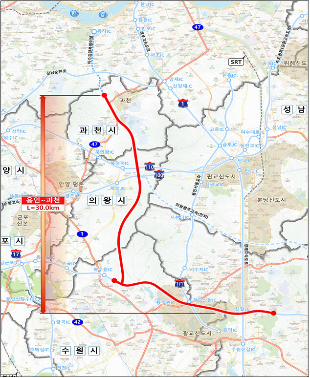 용인~과천 지하고속도로는 2021년 2차 국가도로망 종합계획(2021~2030년)과 2022년 2차 고속도로 건설계획(2021~2025년)에 반영돼 추진된 사업으로 용인~수원~과천 구간을 잇는 왕복4차로 고속도로(지하터널 21.1km 포함 30.0km)를 신설하는 사업이다. 사업비 2조 7576억원이 책정됐다.