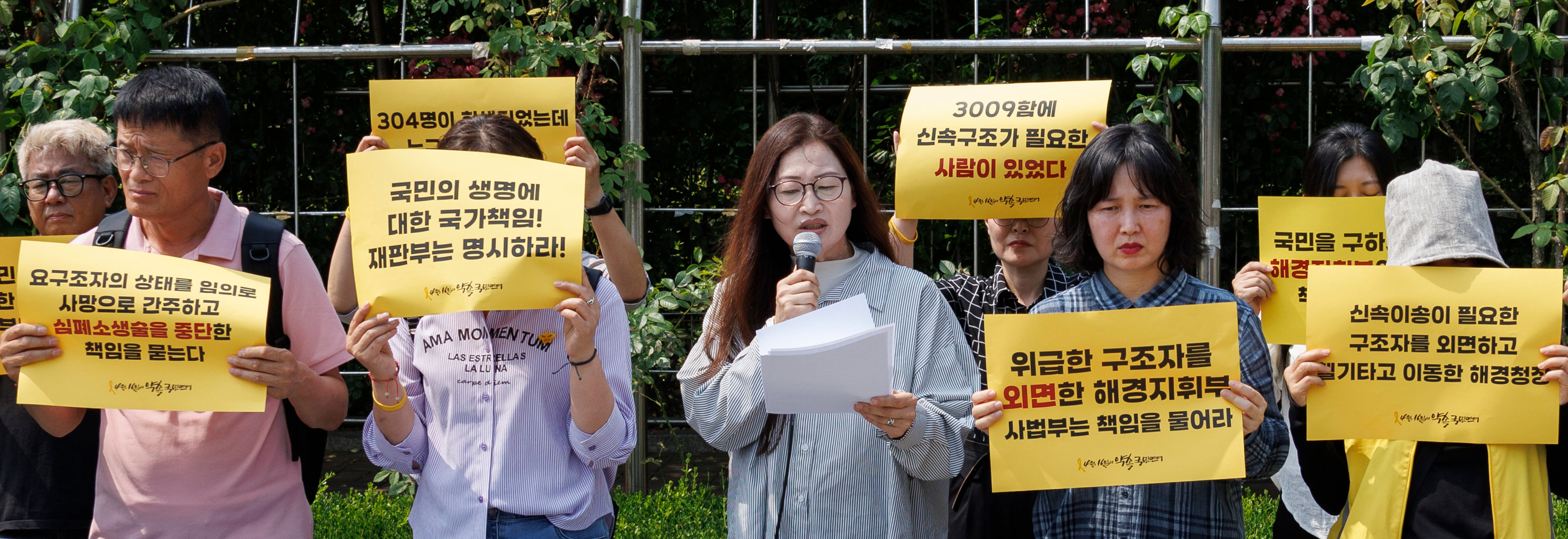 지난해 6월 서울 서초구 서울중앙지법 앞에서 4월 16일의 약속 국민연대 주최로 열린 고 임경빈 군 구조 방기 손해배상 판결 관련 피해 가족과 시민의 입장 발표 기자회견에서 임 군의 어머니 전인숙 씨가 판결과 관련한 입장을 말하고 있다. /연합뉴스 |