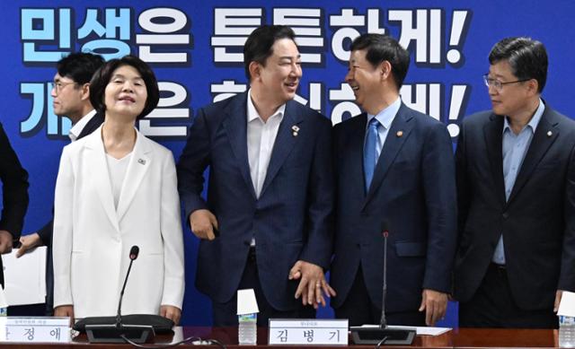 김병기(왼쪽 두번째) 더불어민주당 원내대표와 구윤철(세번째) 경제부총리 겸 기획재정부 장관이 20일 오전 서울 여의도 국회의원회관에서 열린 새 정부 경제성장전략 당정협의에서 기념 촬영에 앞서 대화를 하고 있다. 고영권 기자 |