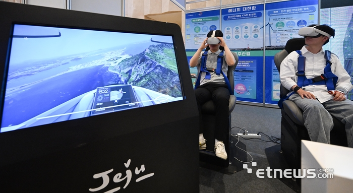 지난달 9일 제12회 국제e모빌리티 엑스포가 제주 서귀포시 신화월드 컨벤션센터에서 열렸다. 참관객이 제주형 도심항공교통(UAM)시뮬레이터 체험을 하고 있다.(제주=이동근기자 foto@etnews.com) |