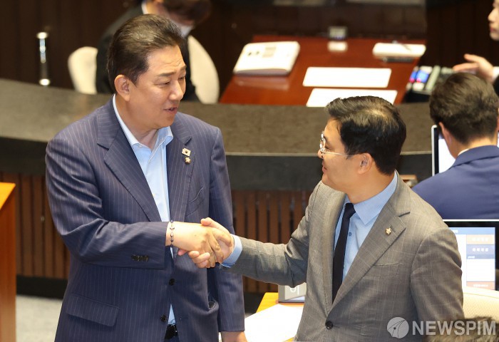 [서울=뉴스핌] 정일구 기자 = 김병기 더불어민주당 원내대표가 21일 오전 서울 여의도 국회에서 열린 제428회 국회(임시회) 제1차 본회의에서 동료 의원과 인사를 나누고 있다. 2025.08.21 mironj19@newspim.com |
