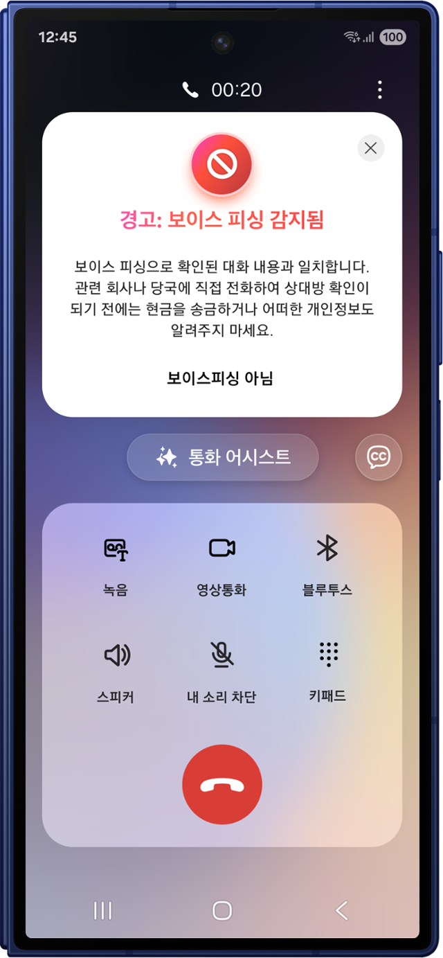 삼성전자 갤럭시 Z 폴드7·플립7 스마트폰에 탑재된 '보이스피싱 의심 전화 알림' 기능의 작동 화면. 삼성전자 제공 |