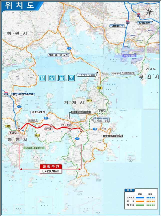 사업은 국토교통부와 경남도가 총 1조5000억 원을 들여 2035년까지 통영 용남면(통영 IC)에서 거제 상문동(거제 IC)까지 20.9㎞ 구간을 편도 2차로로 신설하는 것이다. 노선에는 해상·육상 교량 16곳(4.5㎞), 터널 6곳(6.6㎞)이 포함된다.