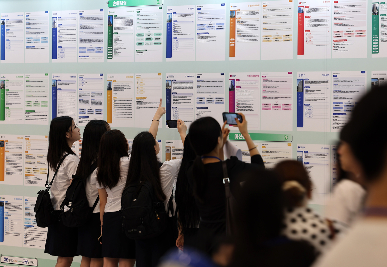 서울 동대문디자인플라자에서 열린 2025 금융권 공동채용 박람회에서 구직자들이 금융권 취업백서 게시대의 기관 정보를 바라보고 있다. [연합] |