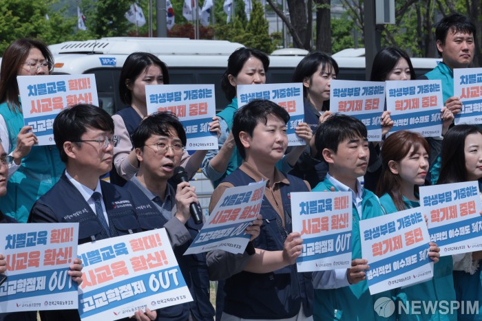 [서울=뉴스핌] 이길동기자= 교사노동조합연맹, 전국교직원노동조합 관계자들이 8일 서울 종로구 정부서울청사 앞에서 고교학점제 폐지 서명운동 결과 발표 기자회견을 하고 있다. 2025.05.08 gdlee@newspim.com |