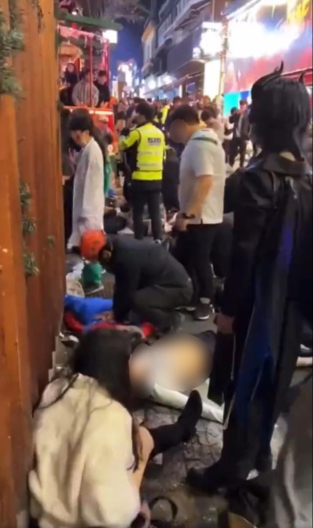 2022년 10월 29일 서울 용산구 이태원 일대에서 경찰과 소방119구조대원, 시민들까지 의식 잃은 환자들을 심폐소생술(CPR) 하며 구조활동을 펼치고 있다. 뉴스1 |