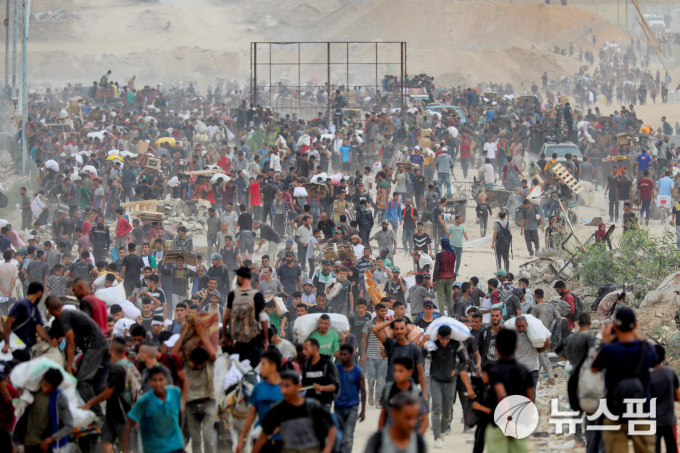 [가자 로이터=뉴스핌] 장일현 특파원 = 지난 1일(현지시간) 팔레스타인 가자지구의 한 중부 지역에서 주민들이 미국이 지원하는 가자인도주의재단(GFF)이 배포한 구호물품을 받은 뒤 집으로 돌아가고 있다. 2025.08.04. ihjang67@newspim.com |