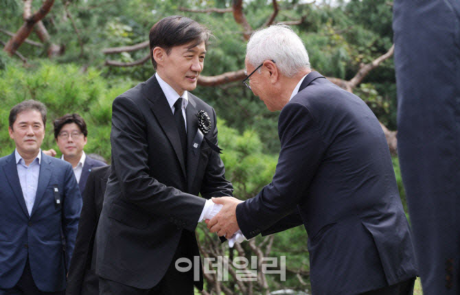 조국 전 조국혁신당 대표가 18일 서울 동작구 국립서울현충원 내 김대중 전 대통령 묘역을 찾아 참배하기 앞서 배기선 김대중재단 사무총장과 인사하고 있다. (사진=방인권 기자) |