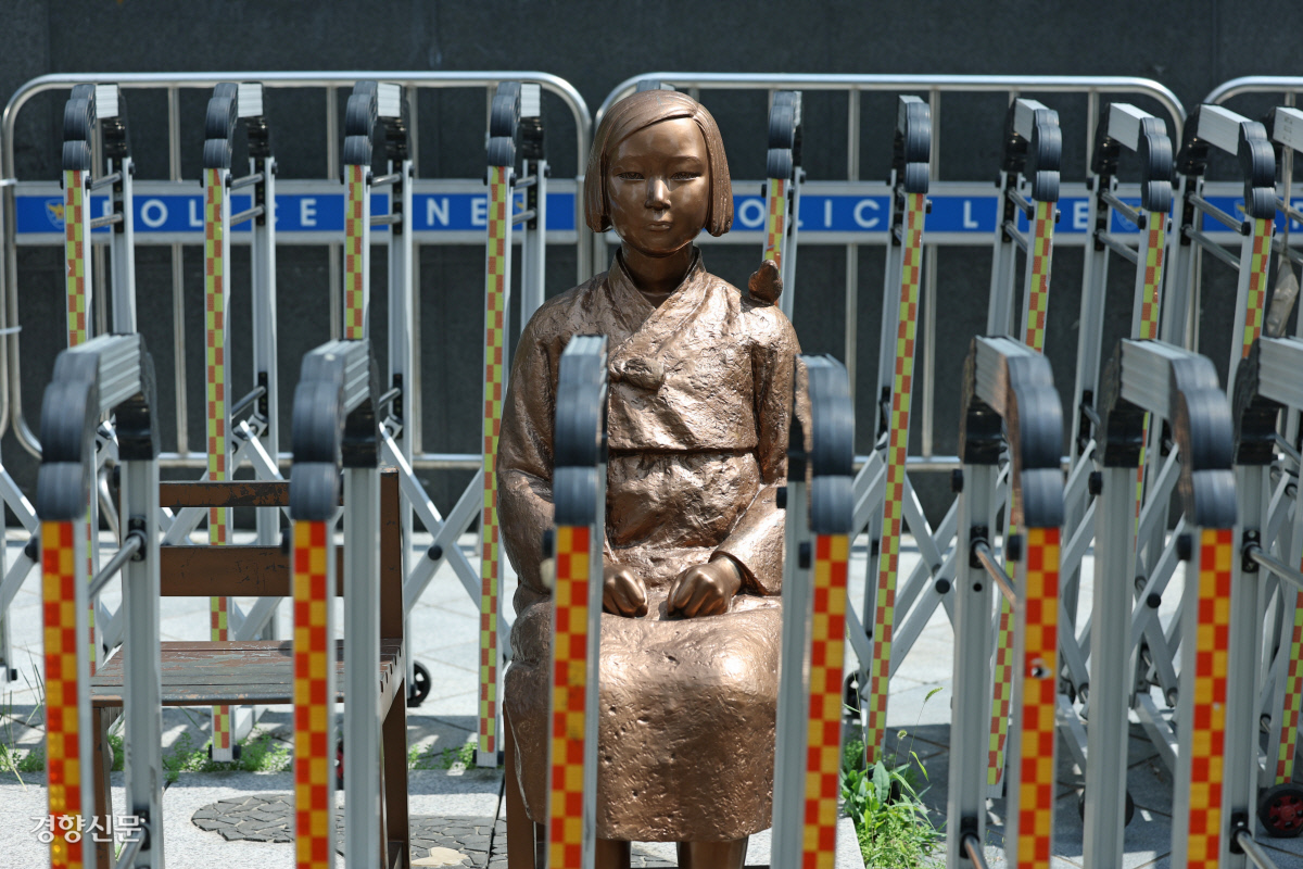 경찰 펜스에 둘러싸인 소녀상 이재명 대통령이 이전 정권에서 합의한 일본군 위안부 및 강제징용 배상 문제에 대해 유지의 뜻을 밝혔다고 일본 언론이 보도한 21일 서울 종로구 옛 일본대사관 앞 평화의 소녀상이 경찰 펜스로 둘러싸여 있다. 정효진 기자 |
