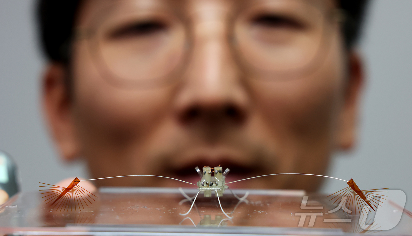 (세종=뉴스1) 김기남 기자 = 고제성 아주대학교 기계공학과 교수가 지난 21일 세종시 정부세종청사에서 수면 위를 자유자재로 기동하는 곤충인 라고벨리아(부채다리 소금쟁이)를 모사하여 세계 최초 개발한 초소형 로봇을 선보이고 있다. 2025.8.22/뉴스1