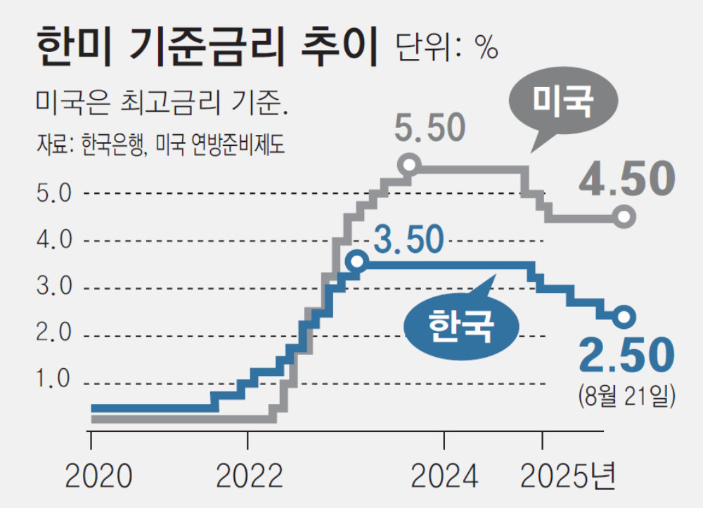 연준의 금리 동결 가능성이 높아지면서 한은의 부담도 커졌다. 올 상반기(1∼6월) 부진했던 내수가 하반기(7∼12월) 들어 반등할 조짐이 보이고 있지만 안심할 수 없기 때문이다. 이달 7일 공식 발효된 미국 상호관세의 효과가 본격적으로 반영되면 수출이 둔화될 수 있다. 반도체, 자동차 등 국내 주요 산업을 둘러싼 불확실성이 여전해 수출 경쟁력을 이어가려면 금리 인하에 나서야 한다는 주장이 나온다. 금리 인하로 원화 가치가 하락(원-달러 환율은 상승)하면 수출 가격 경쟁력이 높아지기 때문이다. 이달 1일 국내 증시 급락과 함께 1401.4원까지 올랐다가 하락한 원-달러 환율은 19일 1390원대로 올랐다. 이틀 연속 1390원대 후반에서 횡보 중이다. 주원 현대경제연구원 경제연구실장은 “연내에 금리를 인하한다면 가능한 한 신속하게 해야 한다”고 말했다.