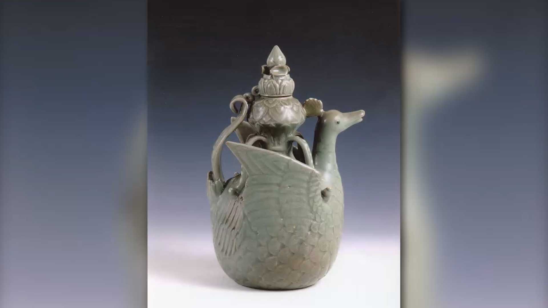 연꽃봉우리를 등에 지고 봉황이 날아오르는 형태로 고려 중기에 제작된 음료 용기로 추정되는 해당 청자는 800년 전 청자 전성기 최상급으로 평가받습니다.