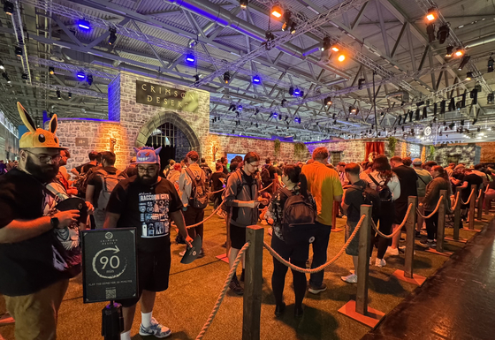 21일(현지시간) 독일 쾰른에서 열린 글로벌 최대 게임쇼 '게임스컴2025'에서 국내 게임사 펄어비스의 ‘붉은사막’ 시연을 위해 90분 대기 지점까지 줄을 선 관람객들. 사진 여성국 기자 |
