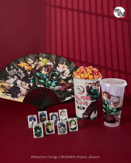 컬래버레이션 메뉴로는 카마도 탄지로의 기술 '히노카미 카구라(해의 호흡)'를 모티브로 해 빨간 불꽃을 팝콘 알갱이로 형상화한 '히노카미 카구라 팝콘'을 출시한다. 굿즈로는 등장인물 12명의 캐릭터를 각각 키링으로 선보인 '캐릭터 메탈 키링'이 있으며, 탄지로 일행의 모습을 담은 '리유저블컵 & 미니 아크릴키링', 등장인물 12명을 한 곳에 담은 '캐릭터 접이식 부채' 등을 만나볼 수 있다. 협업 상품은 전국 108개 CGV에서 선보인다.