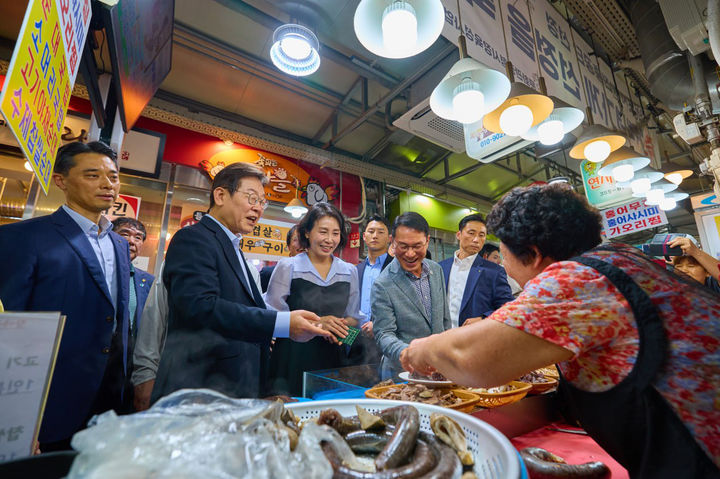 [서울=뉴시스] 최동준 기자 = 이재명 대통령과 김혜경 여사가 17일 서울 은평구 연서시장을 방문해 순대 등을 구매하고 있다.이날 이 대통령은 민생회복 소비쿠폰 효과 민심 청취를 하며 생활용품과 찬거리를 온누리상품권으로 구매했다. (사진=대통령실 제공) 2025.08.17. photo@newsis.com *재판매 및 DB 금지 |