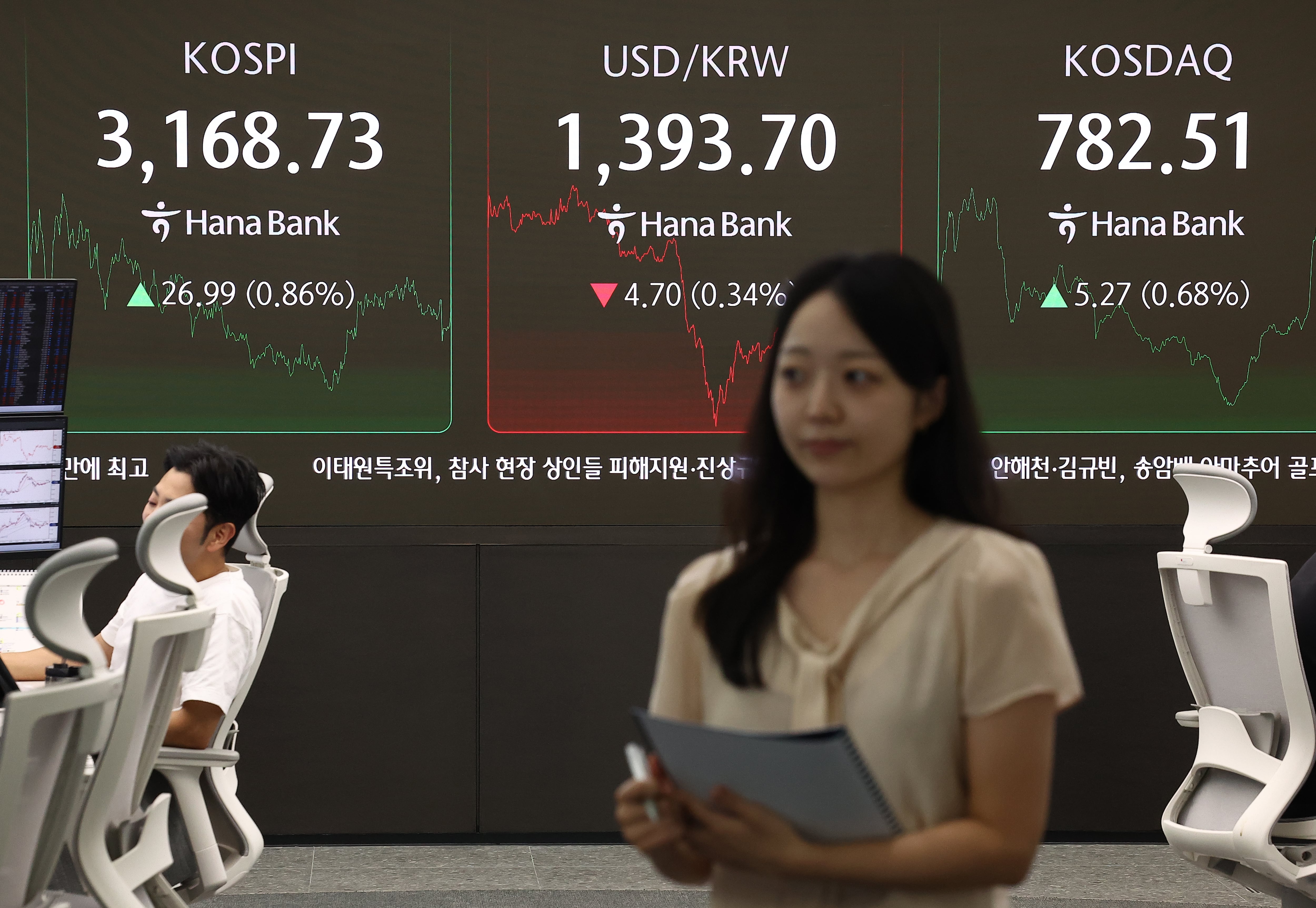 22일 오후 서울 중구 하나은행 본점 딜링룸 현황판에 코스피 지수, 원/달러 환율, 코스닥 지수가 표시돼 있다. /연합뉴스 |