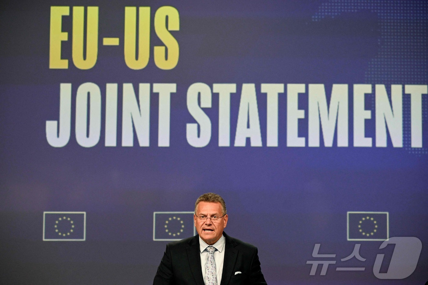21일(현지시간) 브뤼셀에 위치한 유럽연합(EU) 집행위원회에서 마로시 셰프초비치 EU 통상·경제안보·기관 간 관계·투명성 담당 집행위원이 EU-미국 관세 합의에 관한 기자회견을 열고 있다. 2025.08.21.ⓒ AFP=뉴스1 |