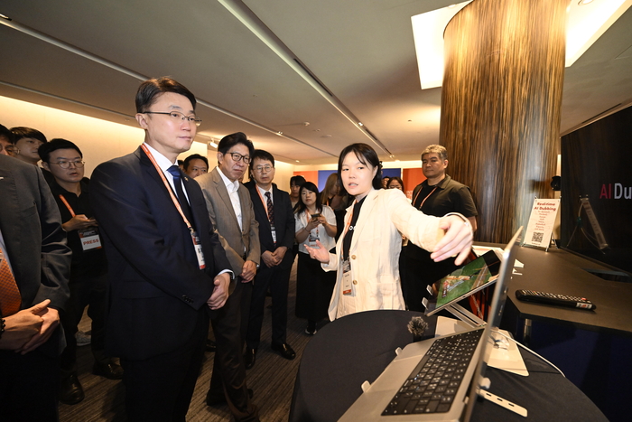 류제명 과학기술정보통신부 2차관이 22일 오전 부산 파라다이스호텔에서 열린 '2025 국제 스트리밍 페스티벌' 행사장에서 미디어 AI 기술을 참관하는 모습 |