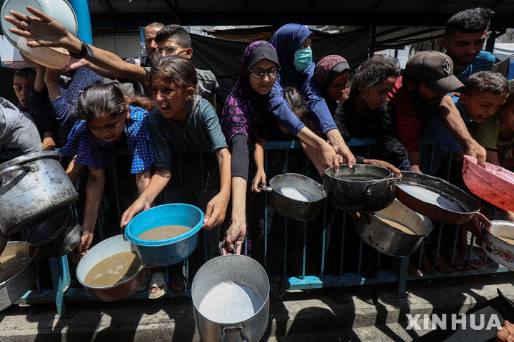 [가자시티=신화/뉴시스] 지난 18일(현지 시간) 가자지구 가자시티의 음식 배급소에서 팔레스타인 피란민들이 무료 음식을 받고 있다. 영국 가디언은 이스라엘군 정보 데이터베이스를 분석한 결과 전쟁 사망자 83%가 민간인이라는 결론이 도출됐다고 21일 보도했다. 2025.08.22. |