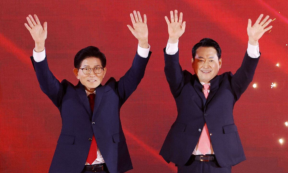 22일 충북 청주시 흥덕구 청주오스코에서 열린 국민의힘 제6차 전당대회에서 결선에 진출한 김문수, 장동혁 당 대표 후보가 손을 흔들고 있다. 연합뉴스 |