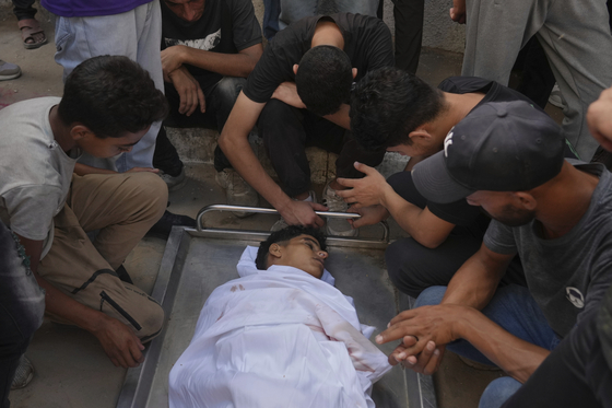 팔레스타인인들이 지난 21일(현지시간) 가자시티 시파 병원 앞에서 구호 트럭에 다가가려다 사망한 이브라힘 알 마그리비(19)의 시신을 애도하고 있다. AP=연합뉴스 |
