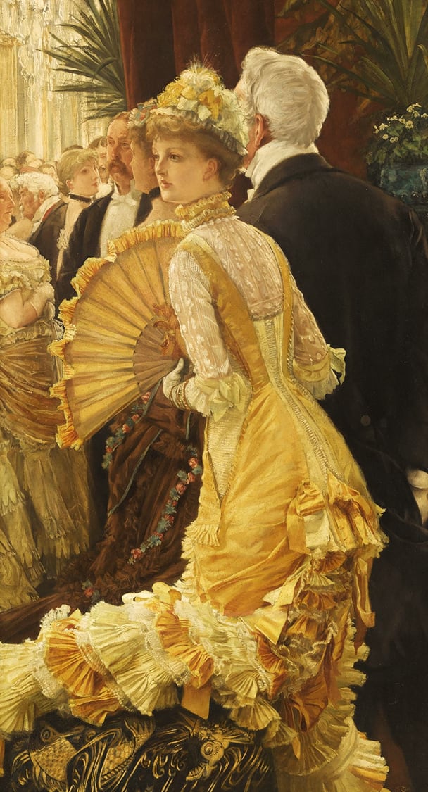 황금빛 드레스가 화사하고 쾌활하다. 리본과 레이스의 물결이 치마 아랫단부터 우아한 곡선을 그리며 상승한다. 주변의 시선을 즐기는 듯 도도한 여인의 표정은 생생히 피어난 꽃들이 장식된 모자와 함께 파리의 삶이 얼마나 즐겁고 행복한지 말하는 것 같다. 하지만 이 그림 ‘무도회’(1880)를 그린 화가 제임스 티소(1836~1902)의 속마음은 달랐을지도 모른다.