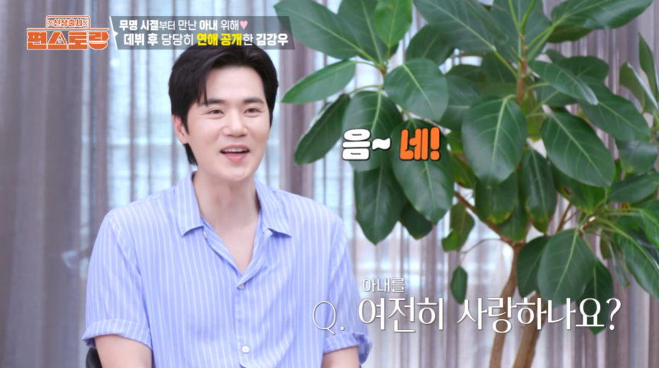 제작진이 "아내는 어떤 사람이냐. 자랑해달라"고 하자 김강우는 "그냥 괜찮은 사람"이라며 "진실 되고 착하고 저랑 제일 친한 친구"라고 애정을 드러냈다.