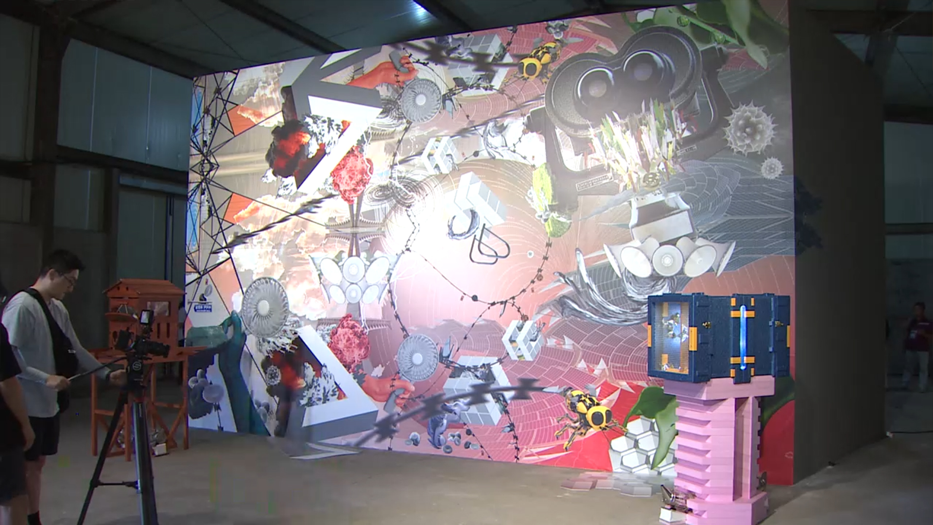 강렬한 색채에 태양광 패널과 손 선풍기, 로봇 벌이 한데 보이는 어딘가 어색한 조합.